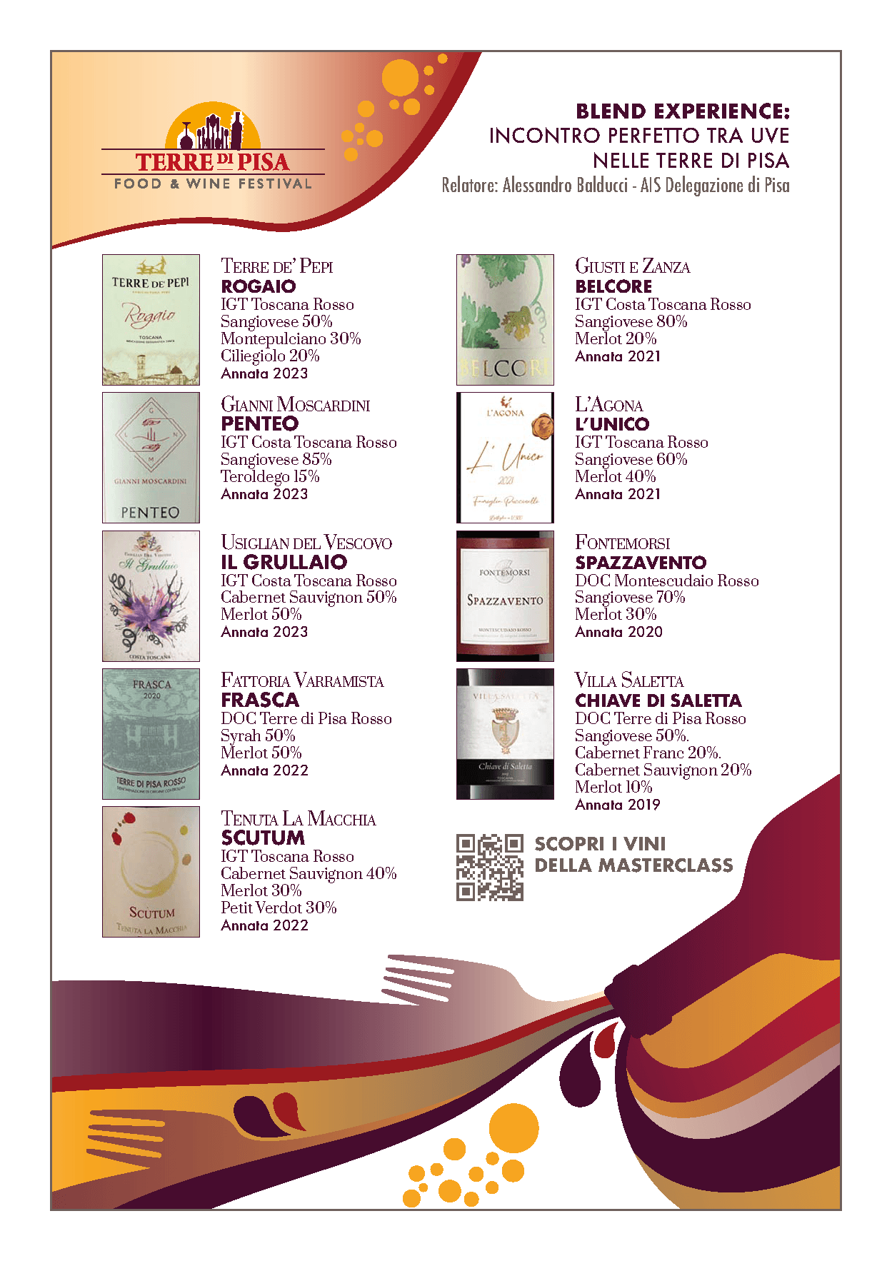 Una masterclass dedicata all’arte del blend nelle Terre di Pisa, dove si scopre come l’incontro tra diverse uve crea un equilibrio perfetto di profumi, sapori e strutture.